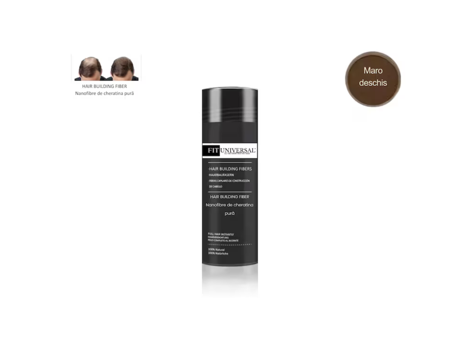 Reda instant densitatea si volumul parului cu Fibrele pentru par rar FITUNIVERSAL, solutia ideala pentru un look natural si increzator. Aceste nanofibre din cheratina se fixeaza electrostatic pe firele de par, oferind un aspect mai bogat si uniform, in doar cateva secunde.